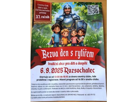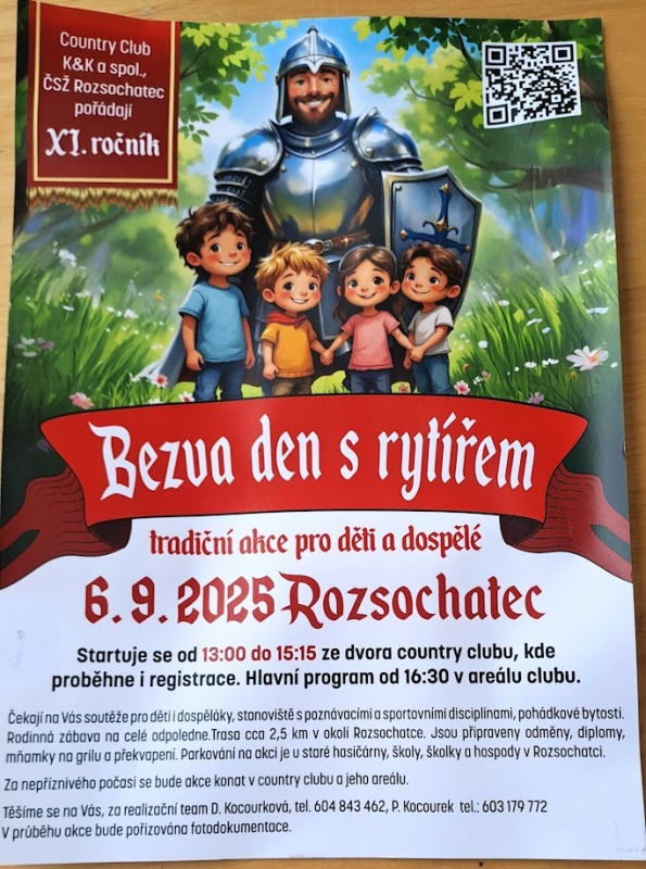 Bezva den s rytířem se konal 6.září 2025. Od 13:00 do 15:15 se startovalo ze dvora country clubu, kde probíhala registrace. Hlavní program pokračoval od 16:30 v areálu clubu. Připraveny byly soutěže pro děti i dospěláky, stanoviště s poznávacími a sportovními disciplínami, pohádkové bytosti, zkrátka rodinná zábava na celé odpoledne. Trasa se stanovišti vedla cca 2,5 km po okolí Rozsochatce. Na soutěžící čekaly odměny, diplomy, mňamky na grilu a překvapení. Akci pořádali členové Country clubu a členky Svazu žen.