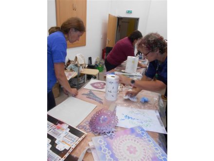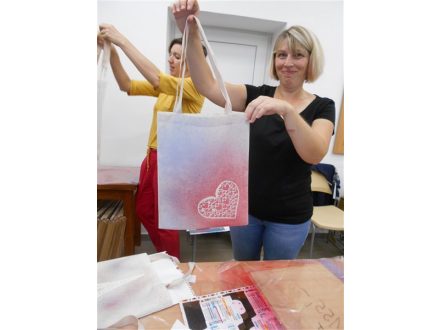 Další tvořivý kurz se konal 2. října opět ve venkovní učebně základní školy a tentokrát to bylo malování na textil s lektorkou Ivou Jouklovou, která ženy učila vyrábět dekorace na tašky pomocí šablon.Všechny výrobky byly pěkné.